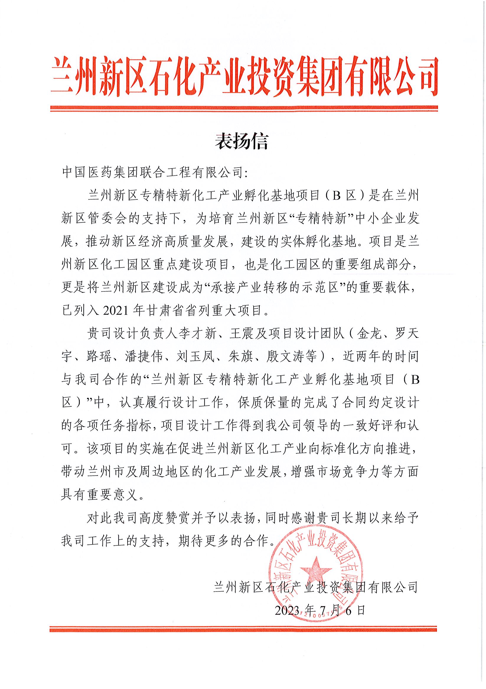 近日,国药工程收到兰州新区石化产业投资集团有限公司发来的表扬信,对上海分公司“兰州新区专精特新化工产业孵化基地项目(B区)”项目团队认真履行设计工作、保质保量的完成了合同约定设计的各项任务指标,给予了高度赞扬以及充分认可。