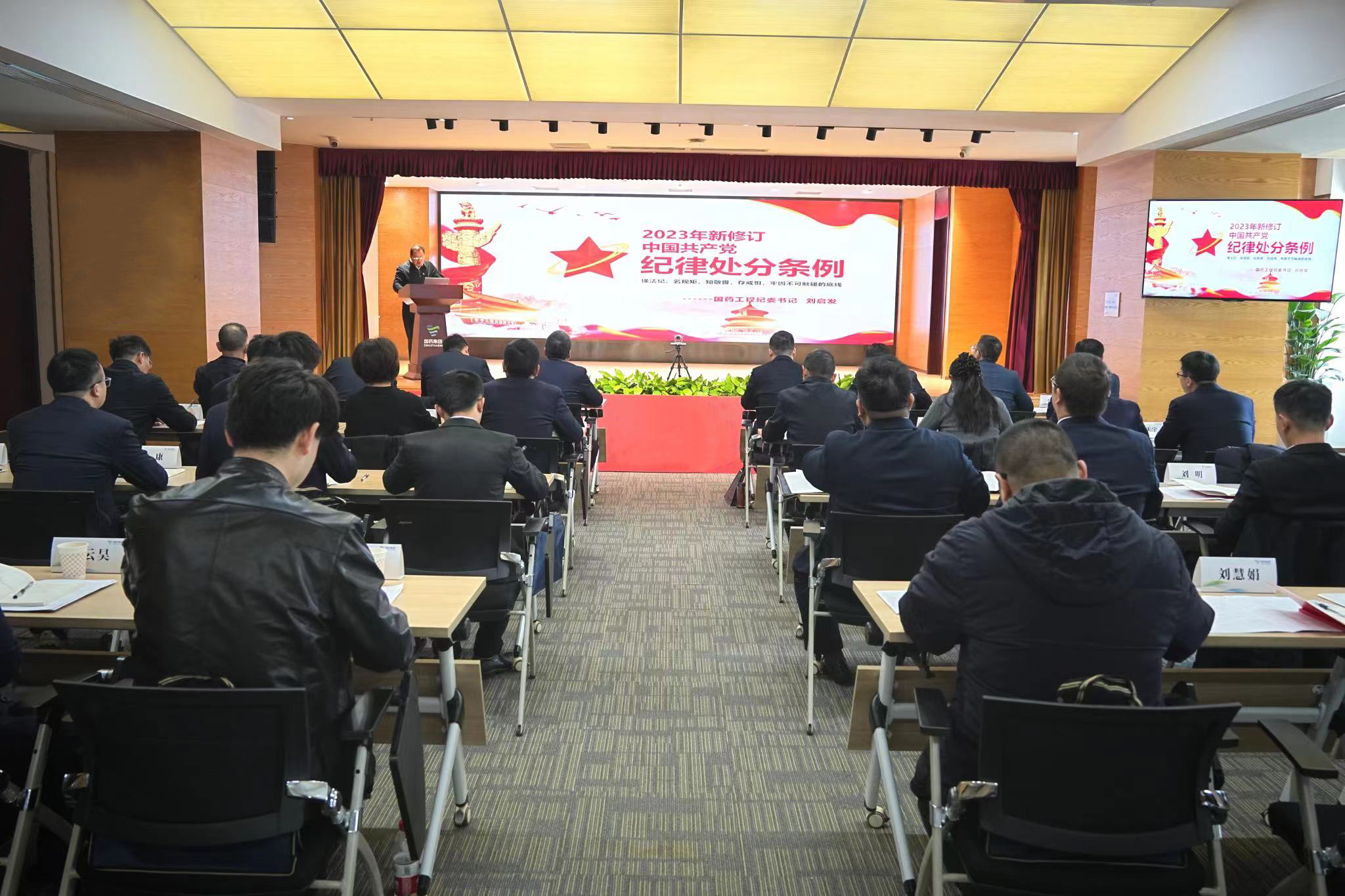 刘启发书记从《条例》修订的重要意义、《条例》修订的亮点和主要内容以及切实推动贯彻落实等三方面为大家进行了细致的讲解和深入浅出的解读,并围绕工程行业从招投标到设计、施工、质量监理、验收评估等环节存在的廉洁风险,结合近期开展的违反中央八项规定精神问题专项治理工作,对参会人员提出了具体的要求。一是要教育引导广大党员干部准确把握新修订《中国共产党纪律处分条例》的内涵要义和实践要求、重点内容和着力方向,深刻认识新修订《条例》的重要意义,强化对《条例》的贯彻执行。深刻领悟习近平总书记关于推进党的自我革命、健全全面从严治党体系、全面加强党的纪律建设重要论述。二是要始终心怀“国之大者”,切实把自己摆进去、把工作摆进去、把职责摆进去。强化自我约束,提高免疫能力,凝聚干事创业的精气神,在新时代新征程上作出新贡献,坚决当好贯彻落实党中央决策部署的执行者、行动派、实干家,做到谋实事、破难题,推动各项工作提质增效,以实际行动助力国药工程高质量发展。