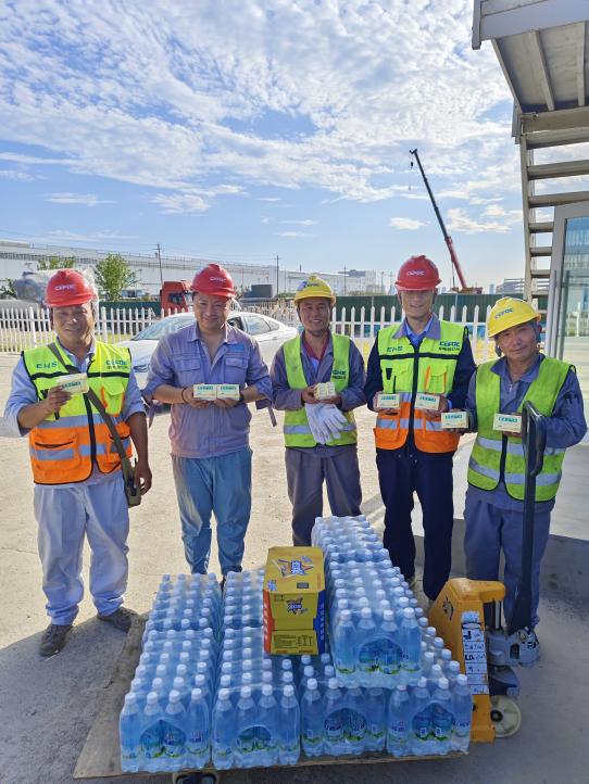 天津麦康项目部为坚守一线的施工人员发放了矿泉水、西瓜、绿豆、酸梅汤等防暑降温物资。同时积极开展普及高温作业防护知识活动,通过专业的讲解与演示,加强防暑知识宣传,提升一线施工人员的防暑安全意识及应急处理能力。