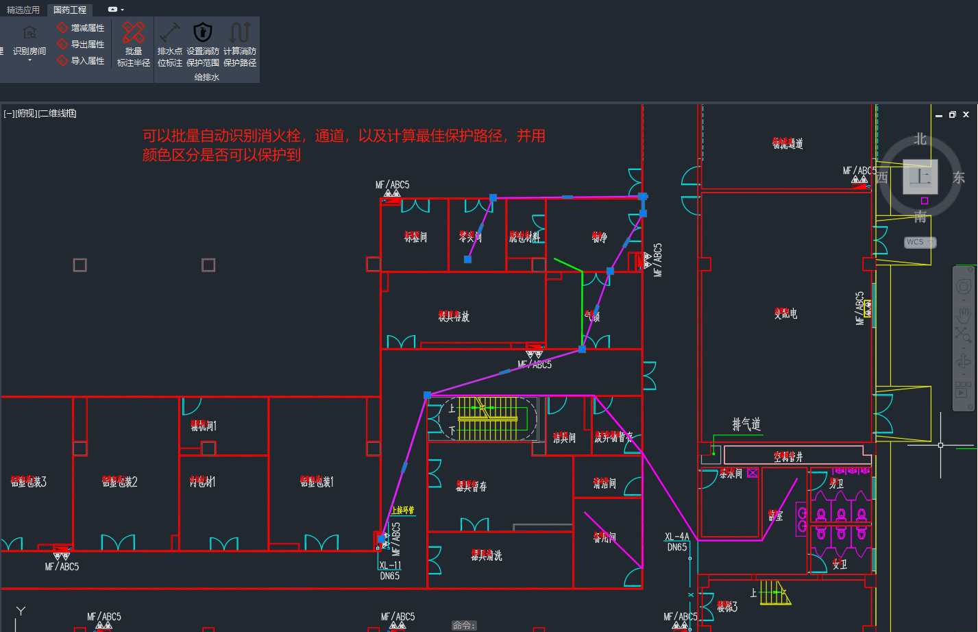 图为消火栓自动路径效果,用于辅助消火栓平面布置,可以有效提高消火栓布置效率