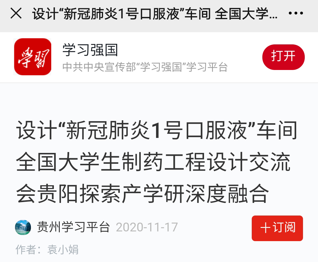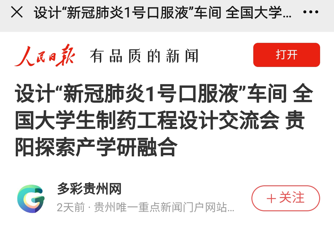 全国大学生制药工程设计交流会 贵阳探索产学研融合》的报道,对中国医药集团联合工程有限公司协办的2020年全国大学生制药工程设计作品交流会进行了关注。
