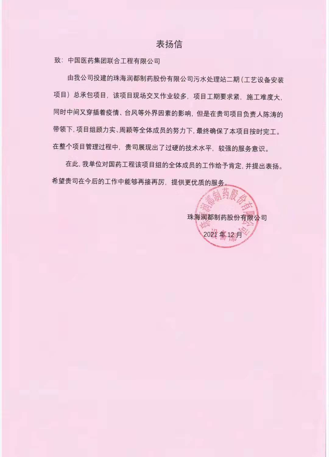让客户满意,为客户创造价值,引领行业发展,是国药工程的使命,更是国药工程的不懈追求。客户的表扬是对国药工程的认可与信任,更是对国药工程综合技术服务实力的充分肯定。未来,国药工程将继续发挥以设计为核心的医药工程全过程技术服务优势,持续提升价值创造能力,携手合作伙伴共赢发展。