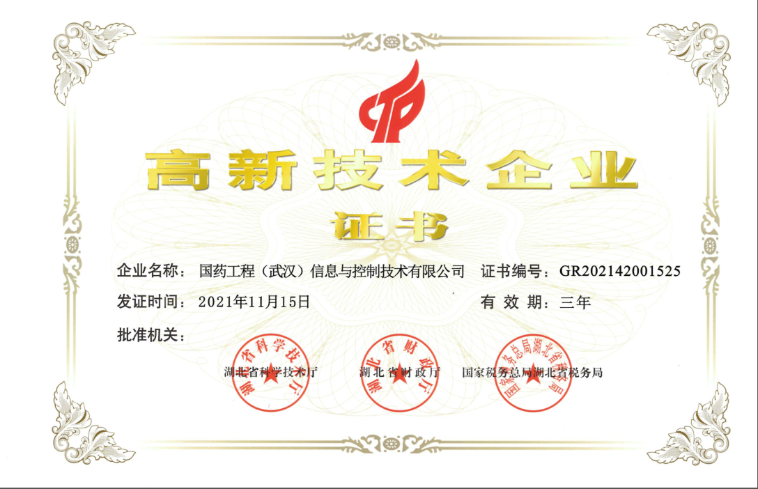 经过湖北省科技局、税务局、财政局的层层评审,国药工程(武汉)信息与控制技术有限公司成功申报高新技术企业。