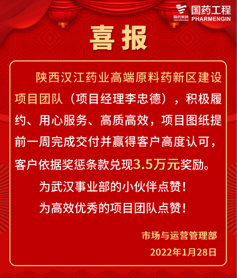 (业主给予国药工程设计团队进度提前奖励)