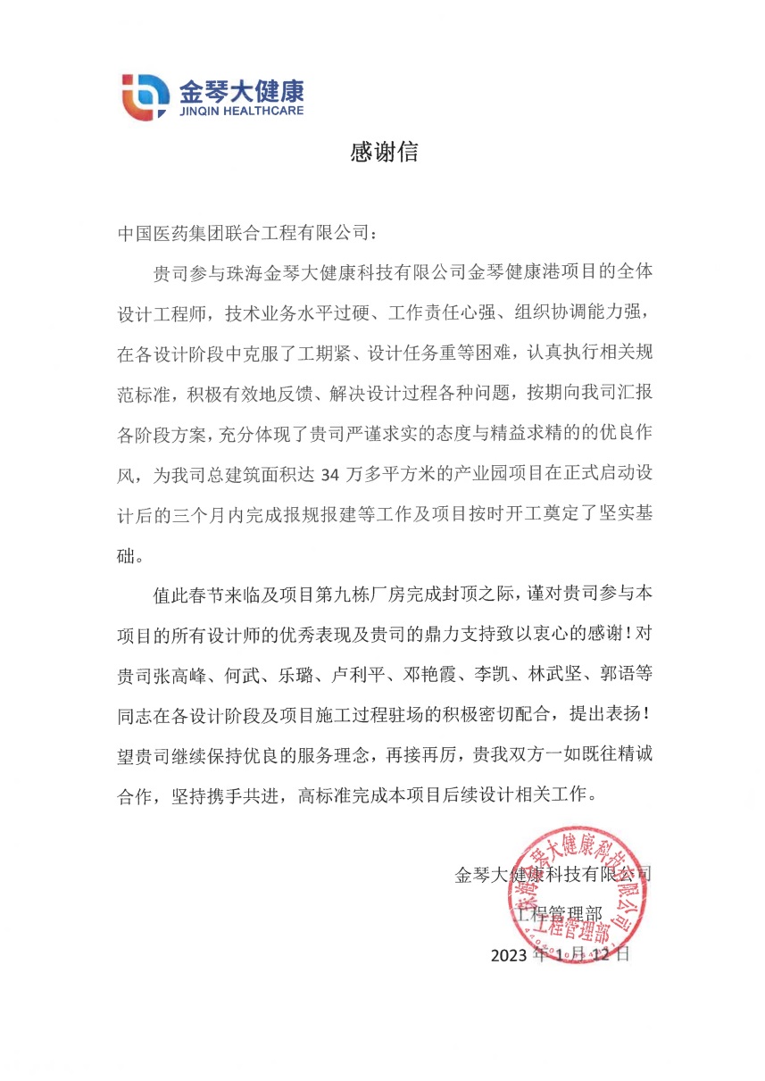 2022年6月至今,国药工程广州分公司以党支部青年突击队为核心设计团队,克服工期紧、设计任务重、需设计驻场服务等困难,实现珠海金琴大健康科技有限公司金琴健康港项目九栋厂房顺利封顶。今日,珠海金琴大健康科技有限公司向国药工程发来感谢信,对公司在项目设计服务全过程所做出的工作表示感谢。